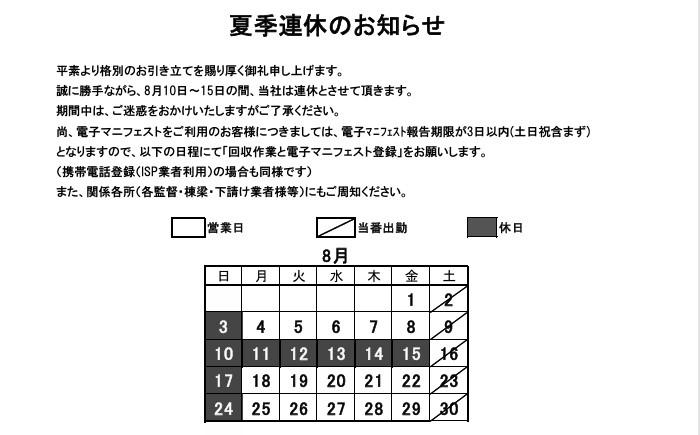 誠に勝手ながら8月10日~15日まで夏季連休と