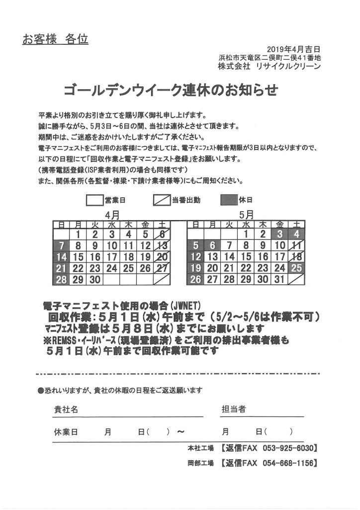 連休のお知らせ ギャラリー 2019年4月25日 磐田工場 こんにちは☀ 磐田工場です。 まもなく大型連休がやってきます。 弊社の連休お知らせ致します。 連休中、ご迷惑お掛け致しますが、よろしくお願いします。 ✿今日の磐田工場✿