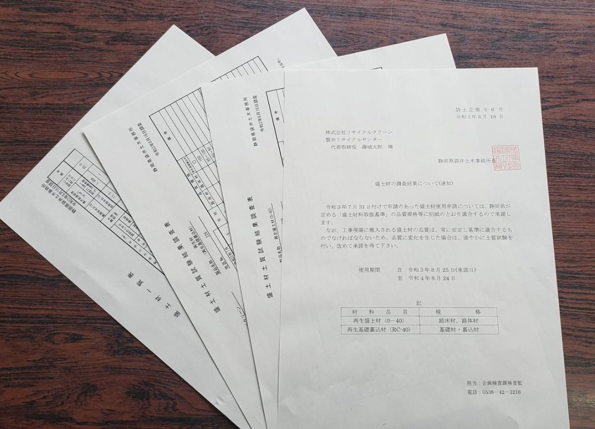 令和3年度 材料承認 2021年9月22日 磐田工場 こんにちは☀ ㈱リサイクルクリーン磐田工場です。 令和3年度の材料承認願が出来て来ました♥♥♥ 静岡県袋井土木事務所に、盛土材使用申請をし 静岡県が定める『盛土材料取扱基準』の品質規格等に適合した為 承諾を得ましたので報告させて頂きます。 現場までの配達も大型ダンプ等にて対応します。 お気軽に相談してください。 ♥♥♥ 磐田市大久保729-1 ㈱リサイクルクリーン磐田工場 ℡ 0538-38-2851 FAX 0538-38-2862 ♥♥♥ ♣♣♣今日の磐田工場♣♣♣