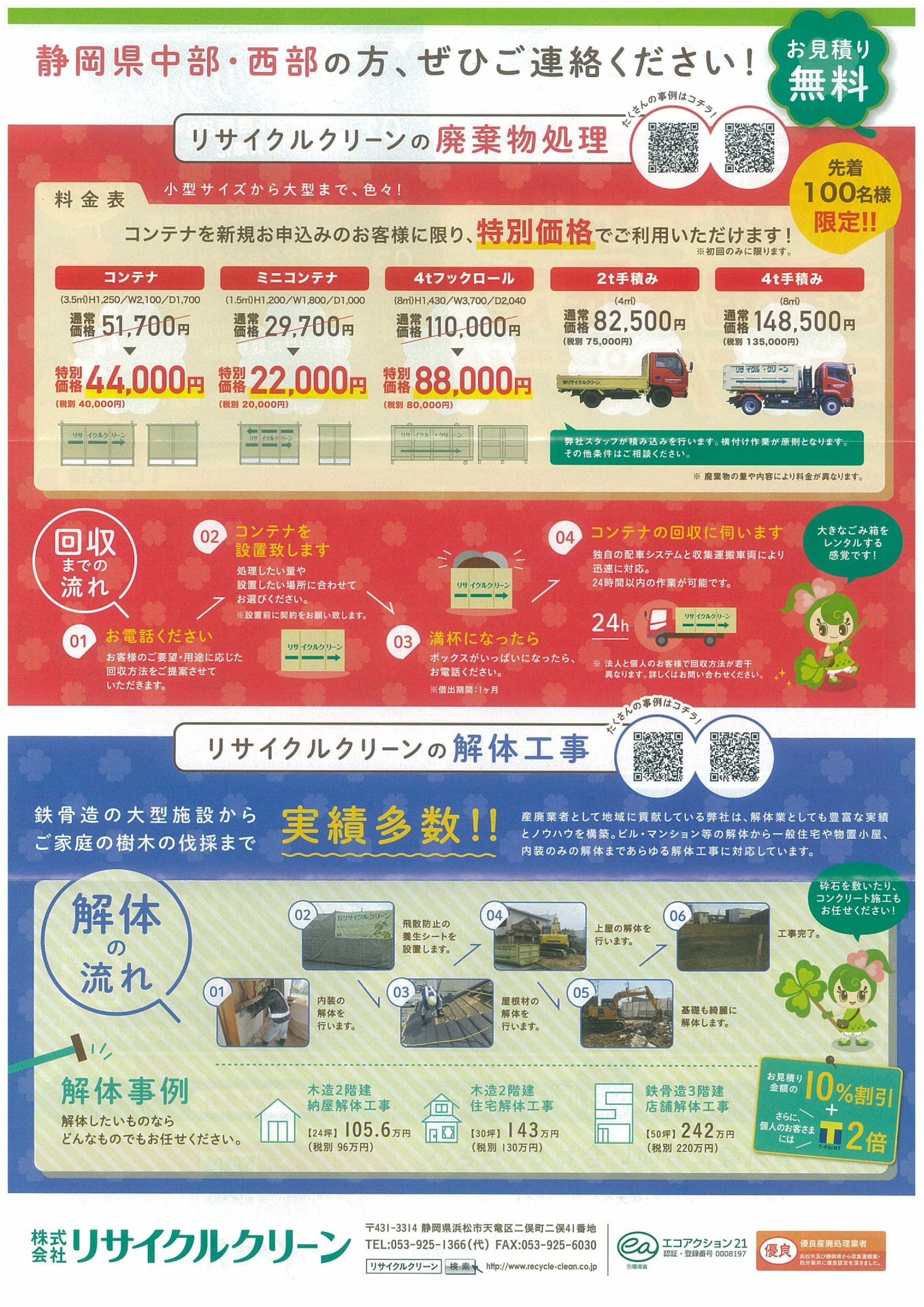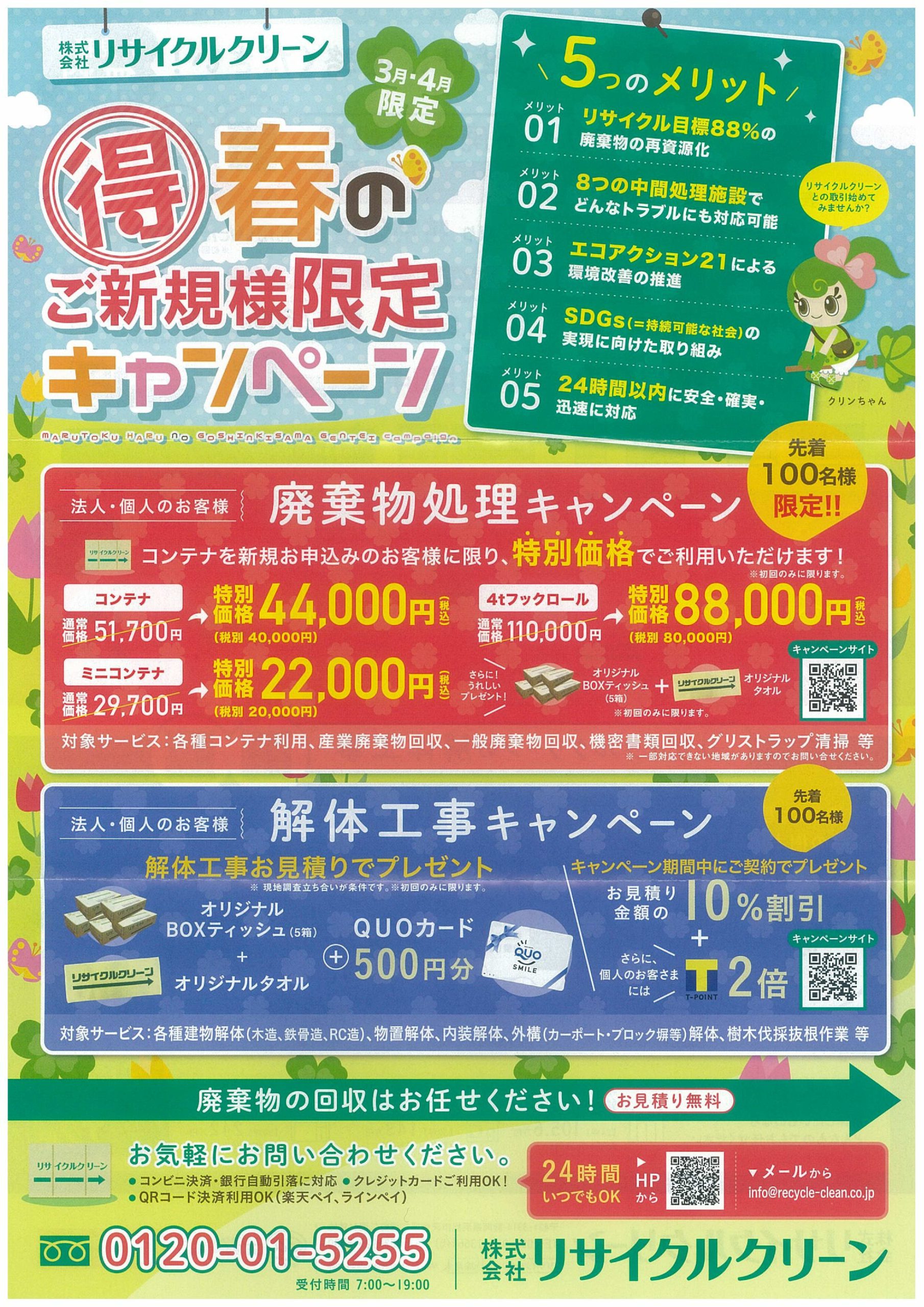 春のご新規様限定キャンペーン!! 2022年3月22日 磐田工場 ㈱リサイクルクリーン磐田工場です。 3・4月限定 春のご新規様限定キャンペーンが始まりました!! ※廃棄物処理キャンペーン コンテナを新規お申込みのお客様に限り特別価格!! ※解体工事キャンペーン 解体工事お見積りでプレゼント!! お気軽にお問い合わせ下さい。 ㈱リサイクルクリーン フリーダイヤル 0120-01-5255