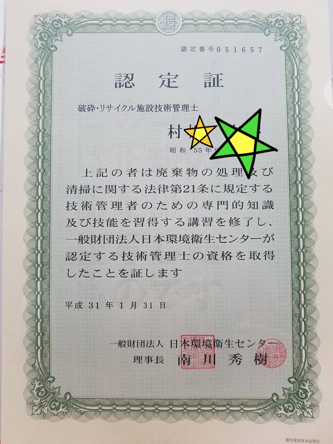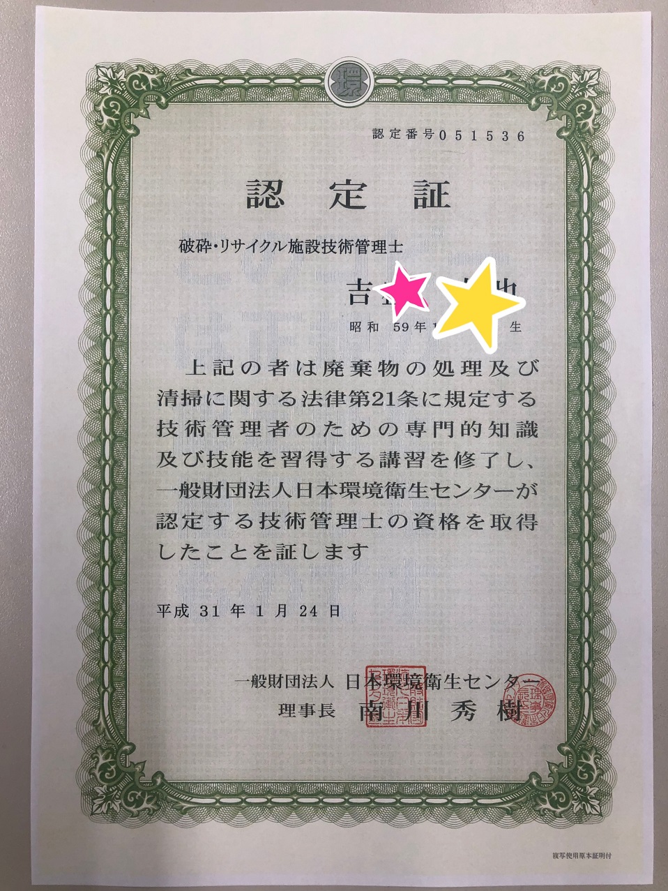 この二人の課長、1月末に「廃棄物処理施設技術管理者」の講習を受け、見事「施設技術管理士」の認定を受ける事が出来ました!!