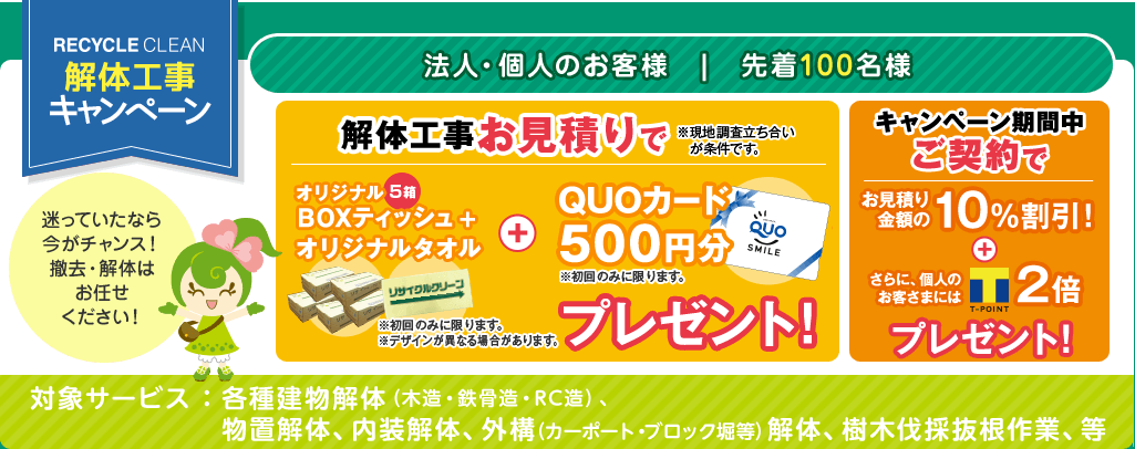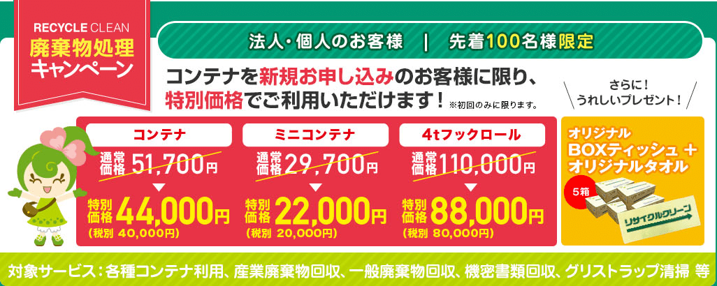 各種コンテナのご利用、産業廃棄物の回収、不用物・粗大ごみ処分、建物解体・樹木伐採・造成工事などなど、新規お申込みのお客様限定で…