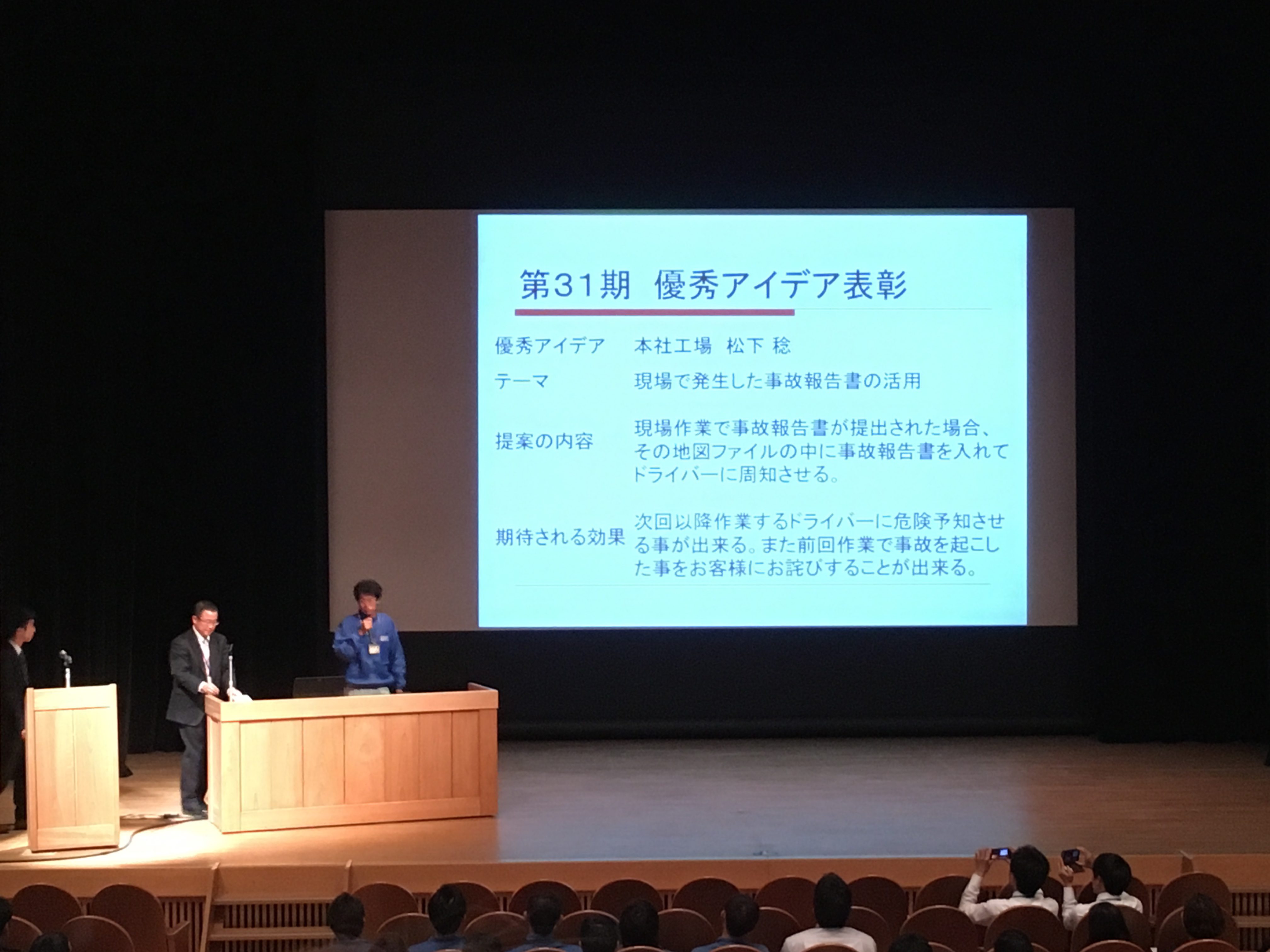 見事ベストオブアイデアに輝いたのは、ドライバー課のM下課長!! 現場で起きた事故の再発防止に繋がるアイデアです。