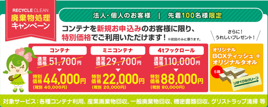 キャンペーンの対象サービスは、各種コンテナのご利用、産業廃棄物回収、不要物・粗大ゴミ処分・建物解体、樹木伐採、造成工事等です。