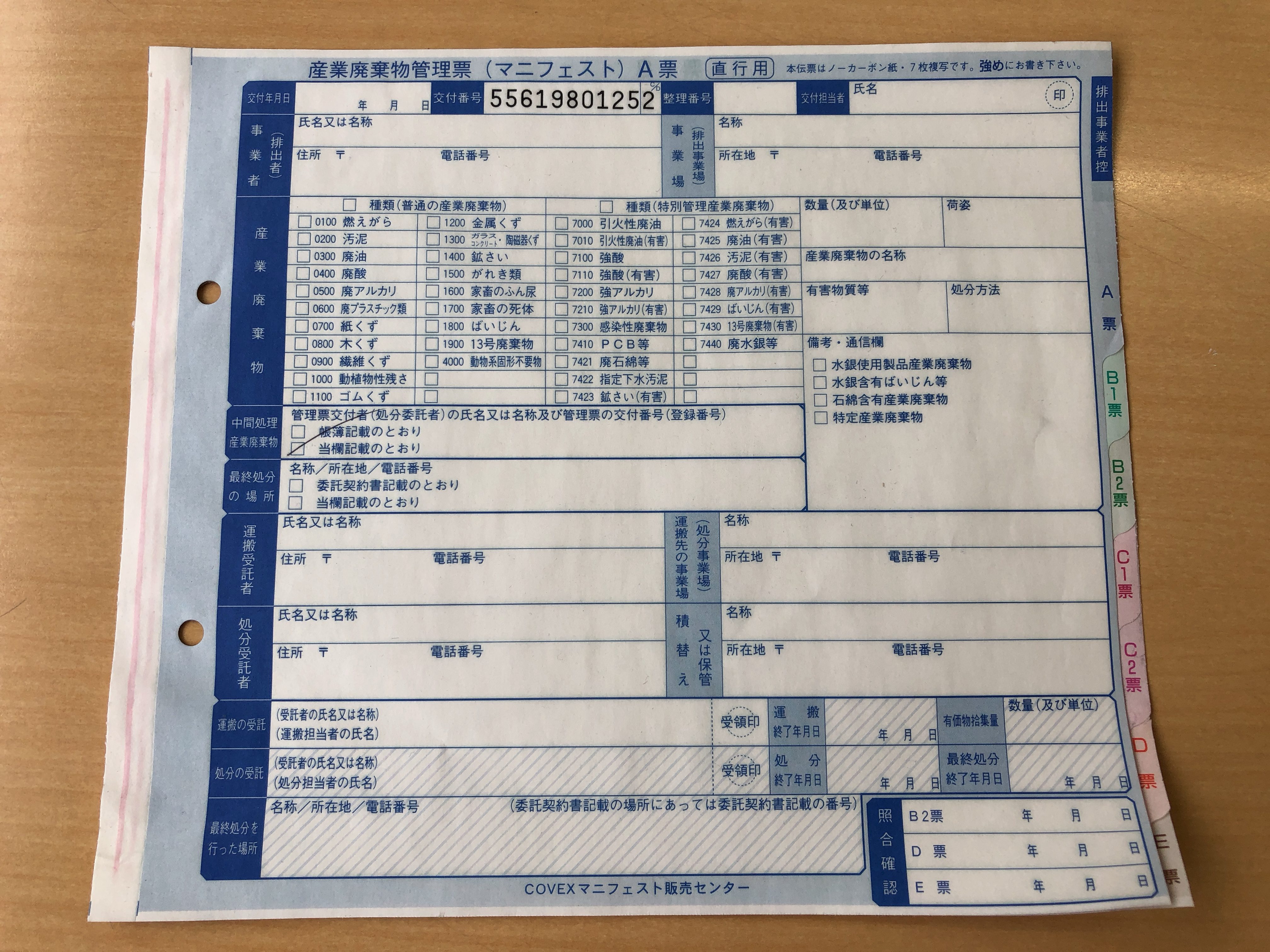 これはお客様が発行する「産業廃棄物管理票(マニフェスト)」に対して、何を、いつ、どのくらい、どこで、どのように処分されたかを適切に記入し、最終処分が終わった時点でお客様に返却する業務です。