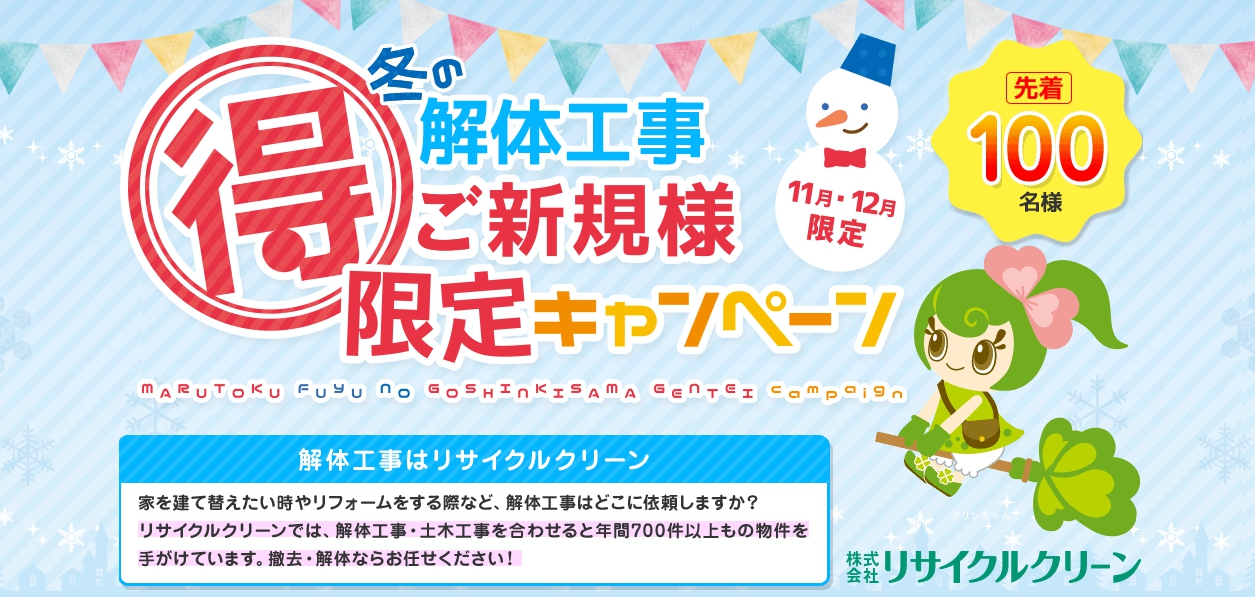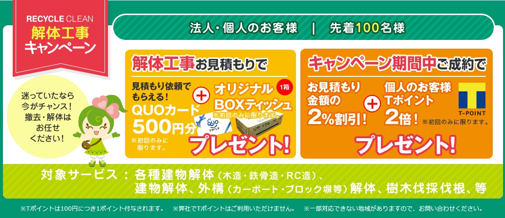解体工事を新規見積依頼でQUOカード500円+オリジナルボックスティッシュ1箱プレゼント。ご成約のお客様にはお見積り金額から2%割引。