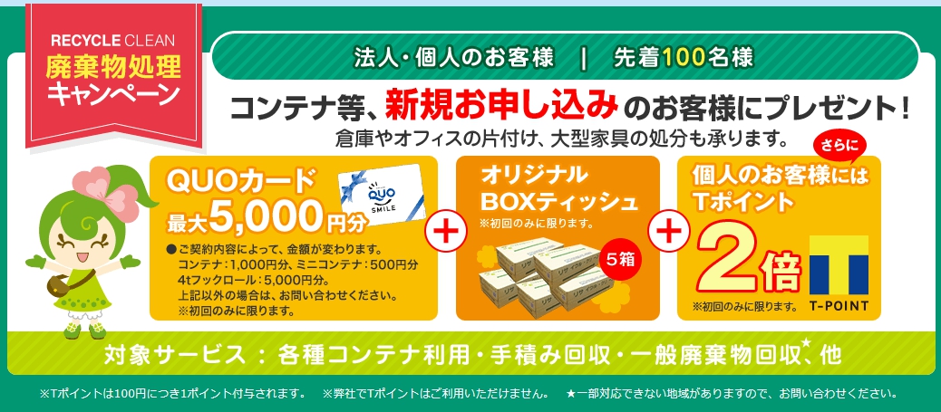 廃棄物処理を新規お申込みのお客様は最大5千円分のQUOカードとオリジナルBOXティッシュ5箱プレンゼント。