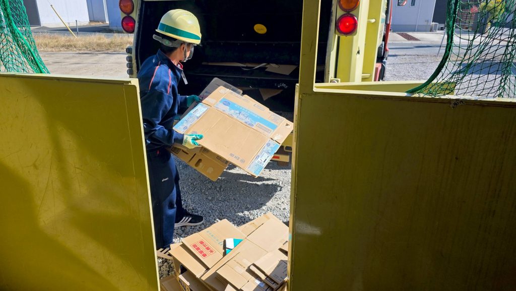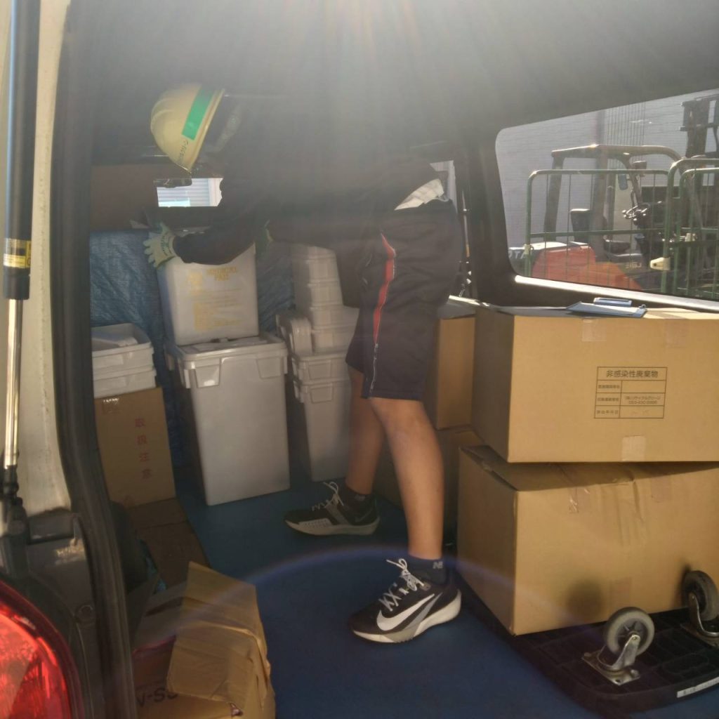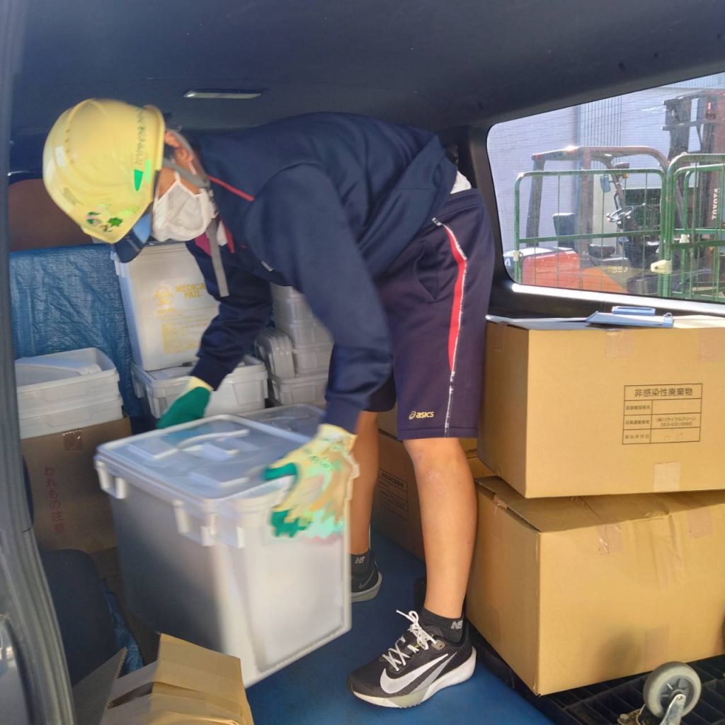 今回はダンボール・古着・新聞雑誌・アルミ缶・ペットボトルなどの資源ゴミの回収作業と、病院や診療所などで使用された医療系廃棄物回収作業を主に体験していただきました。