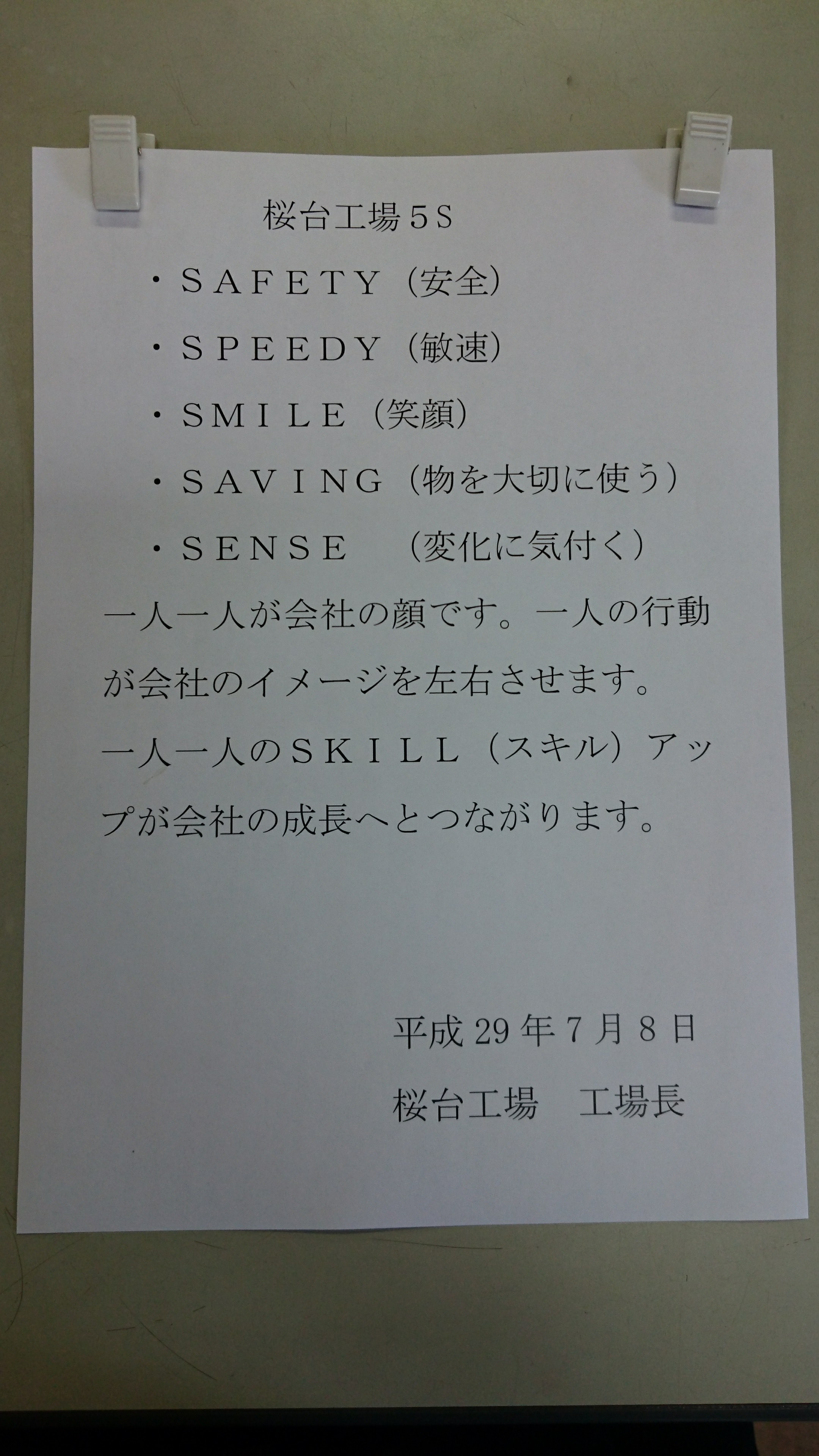 未分類 桜台工場長が考えました! 2017年7月14日 桜台工場 弊社では5S活動に力を入れています 整理・整頓・掃除・清潔・躾 「魅せる工場を創る」を掲げ日々 活動しています 詳しい内容は同じスタッフブログから クリンちゃんを クリックして下さい そして・・・・・・・・ この度、桜台 K工場長が桜台の5Sについて考えてくれました!! いいですね(*^-^*) 意識を高く仕事に取り掛かりたいと思います